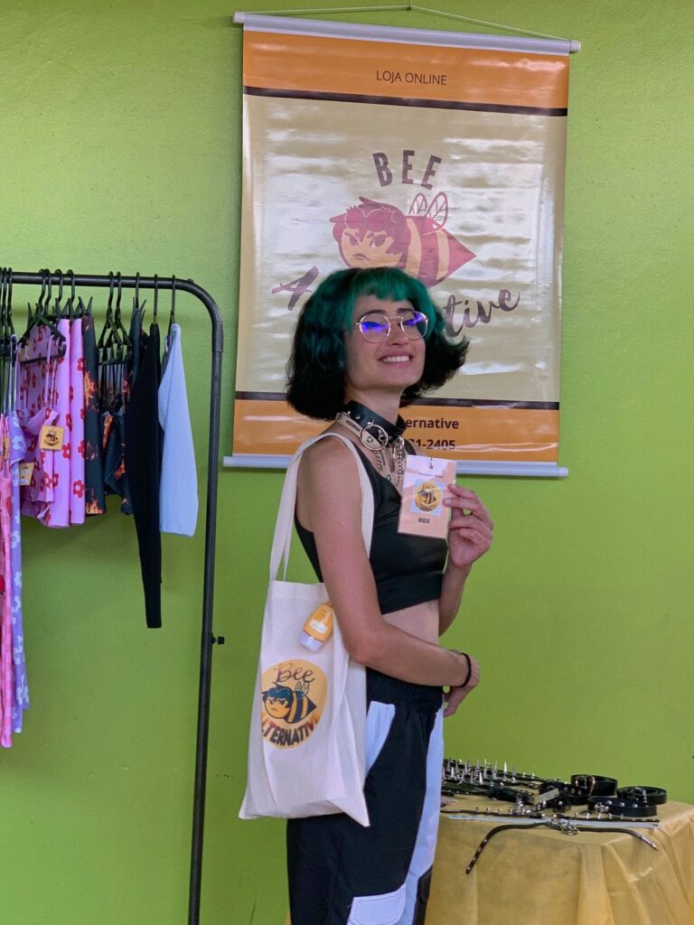 E foi nos laboratórios do Instituto Federal de Brasília (IFB), onde Júlia já se encontrava matriculada desde o início de sua trajetória universitária, agora no curso de Design de Moda, que a marca Bee alternative (@beealternativee) deu seus primeiros suspiros. Fazendo escolhas sustentáveis, alternativas e veganas, ela usa em sua loja só materiais livres de sofrimento animal. O intuito social da marca é sempre pensar no impacto que seus produtos têm no meio ambiente, tentando ser o mais sustentável possível. Seus produtos utilizam o couro sintético como uma das suas principais matérias-primas para a confecção de suas gargantilhas, cintos e pulseiras. Tudo feito com muito amor e carinho. A marca também busca trabalhar não exclusivamente com peças novas. Peças usadas passam pelos processos de upcycling e rework. O upcycling consiste basicamente em dar um novo propósito a materiais que seriam descartados. E o rework é uma técnica de costura que permite que isso seja feito, transformando peças de roupas antigas em peças novas, sendo que elas sempre passam por um processo de curadoria antes de sua destinação para venda.